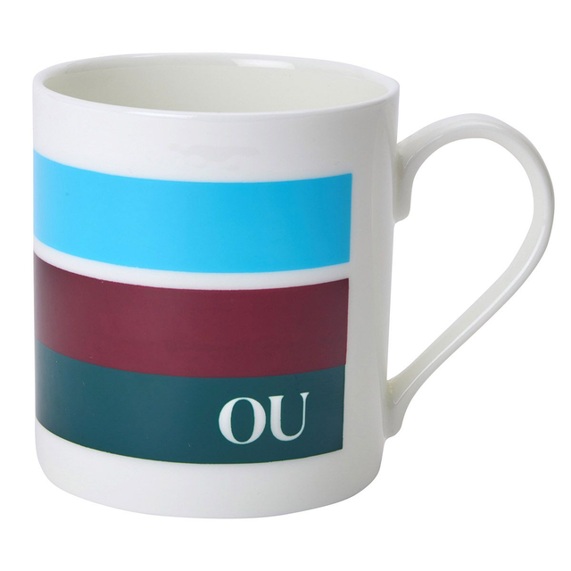 Bone china mug featuring the OU colours. Height 9cm x width 7cm.